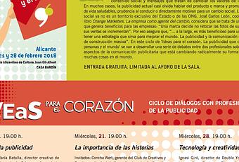 Si vives en Alicante y te interesa la creatividad, toma nota porque este mes de febrero viene cargadito. Todo ello gracias al ciclo de charlas "Ideas para el Corazón. La publicidad que cambia a las personas y el mundo" que se llevará a cabo en el Instituto Alicantino de Cultura Juan Gil Albert del 14 al 28 de febrero. En total serán tres citas con 6 profesionales del mundo de la publicidad y la creatividad que afrontarán tres temas diferentes.
