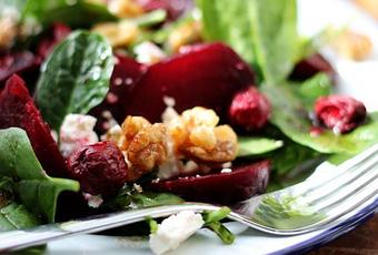 Las cantidades exactas dependen de usted y dependen de la cantidad de gente que está tratando de alimentar. ¿Quieres empezar por tirar las espinacas y rúcula juntos y añadir un aderezo de mostaza, miel y vinagre balsámico, con un generoso chorro de aceite de oliva. A continuación, añada sus remolachas encurtidas, rodajas en pequeños trozos y pedazos cortados en cubitos de queso feta. Las semillas de girasol tostadas por si fuera poco, junto con un poco de sal marina gruesa y pimienta. Si usted es un amante verdadero del queso, puede añadir trozos en rodajas finas de queso parmesano, que completarán el conjunto.