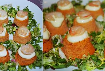 El primero de ellos es este pastel de pescado que conté AQUÍ. Muy fácil de hacer, y al ser moldes pequeñitos no tardan en cuajar más de 2’ en el micro.Los decoré con un poco de mayonesa y una gamba que había hecho previamente al ajillo.