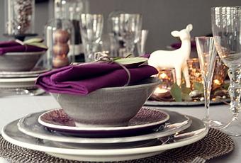 La disposición de todas las piezas de la vajilla apiladas, y de la cristalería mas limpia y reluciente, le aportan ese toque detallado y casi profesional. Un bajo plato, con un mantel individual, o un plato brillante, le pondrán el toque glitter a la mesa.El toque distinto lo conseguimos cuando incluimos una servilleta purpura con una hilo de sisal, enrollado, y un toque fresco y de color con una hoja.Una preparación personal, que hará que la suegra se caiga pa´atras!! ;P