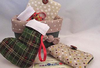 Este fin de semana he estado haciendo unos "detallitos" para regalar a dos personas.Tenía que ser algo muy sencillo, porque era un regalo de agradecimiento y tampoco me parecía oportuno hacer algo que les hiciera sentir incómodas.El pack contenía: una mini cesta, una bota para colgar en el árbol de Navidad y un tarjetero.Las cestas son iguales, y los elementos parecidos, pero distintos.