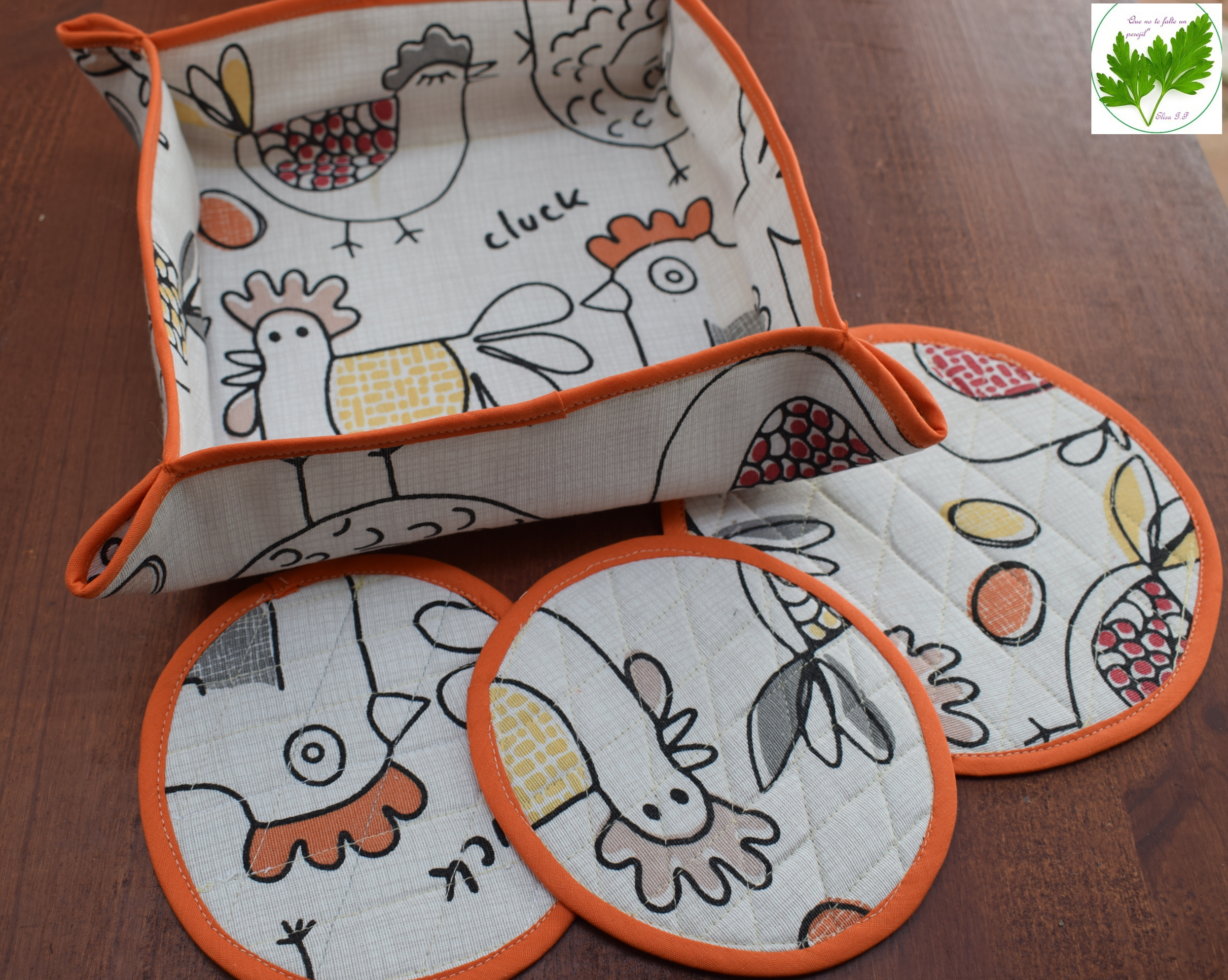Dando uso a algunas telas que me quedaban en casa, hice esta cesta para el pan con agarradores a juego. Sólo tuve que comprar la guata interior y la cinta al biés para adornar los bordes. También un paño de cocina, de éste se me olvidó hacer la foto. Os las muestro por si os sirive como ideas para regalos o por el gusto de disfrutarlas en casa.