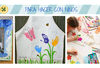 En primer lugar tenemos muchas opciones para hacer con los más peques de la casa. Pueden colaborar pintando un marco de madera para poner después una foto, o decorando una bolsa de tela para mamá Y si son más pequeños pueden plasmar sus pies y manos en una camiseta para mamá (me gusta más que la idea del delantal, que lo veo un poco machista) o para decorar un bonito macetero.