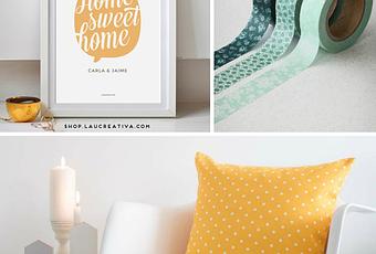 Lámina Home sweet home en mostaza de La Chachitienda | Pack Washitape Flower Esmerald de Made With Lof | Cojín Lunares amarillos de Boho Deco Shop | Pintura Chalk Paint en amarillo de The CraftCake Mama | Lámina Home sweet home en azul de La Chachitienda | Infusor de té personalizado de La tienda del Sofá Amarillo