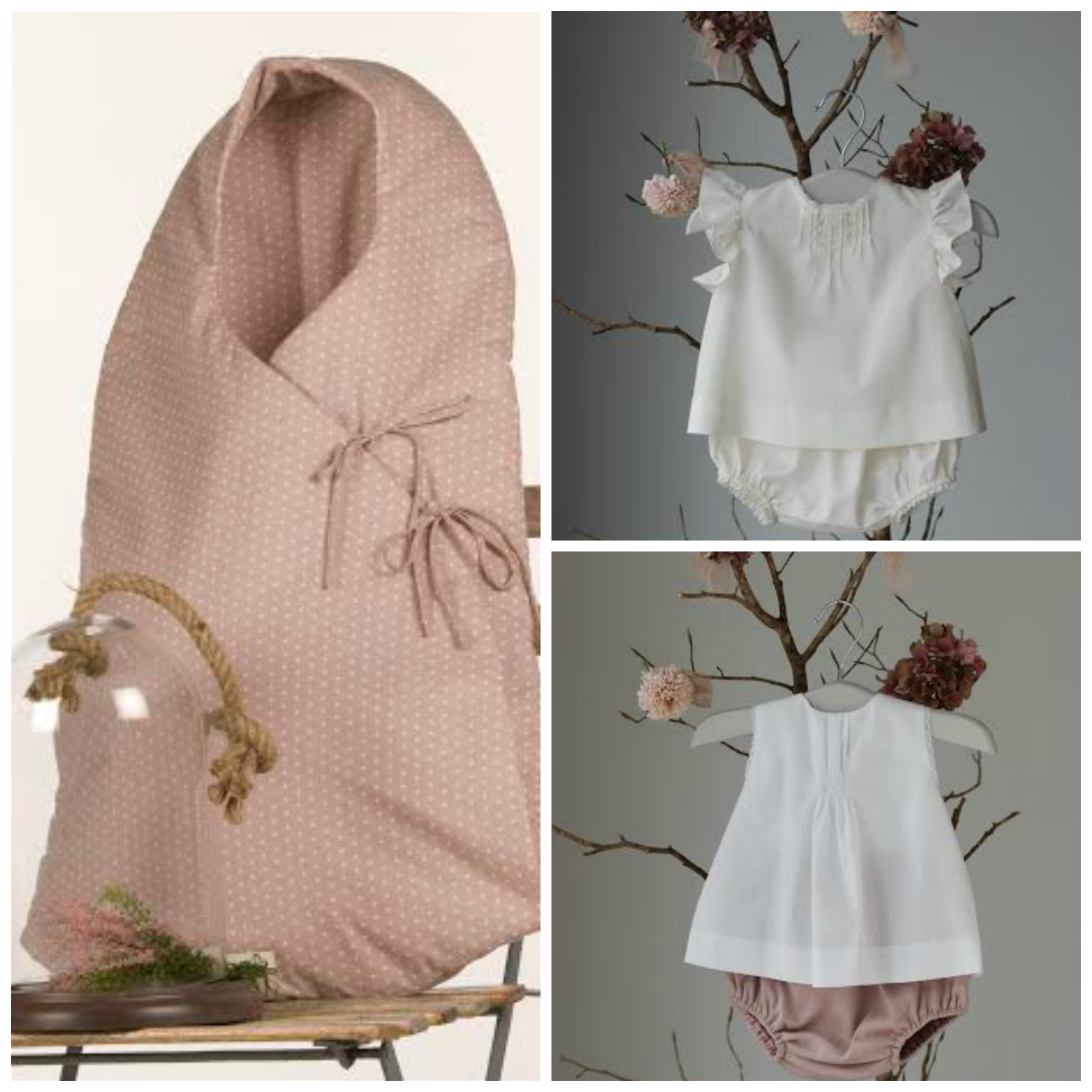 Enamorada de este portabebes, con ese toque afrancesado, me encanta este color rosado aunque también lo puedes encontrar en kaki; si además le pones a tu peque, uno de estos conjuntitos como el primero de dos piezas en voile crudo, me encanta la blusita con el entredós de puntilla valencie y que remata los volantes de los hombros, el coulotte tiene la misma puntilla valencie para el acabado.