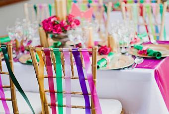 Aquí tienes una idea de lo más llamativa para decorar el banquete de tu boda. El detalle en fucsia en la mesa me gusta mucho, pero sobre todo, las cintas en las sillas son una opción de lo más interesante. ¡Me encanta!