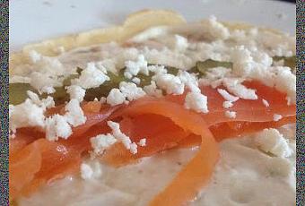 Crepes con salmón, salsa tártara, pepinillos y queso feta