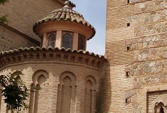 ero centrémonos en los restos mudéjares, el ábside se divide en tres pisos que se alzan sobre un zócalo, cada piso tiene una arquería ciega. El primer piso está decorado con doble arquería de medio punto; el intermedio tiene arquería califal doblada por arcos polilobulados y en el tercero los arcos de herradura apuntados, están doblados por arcos de herradura.