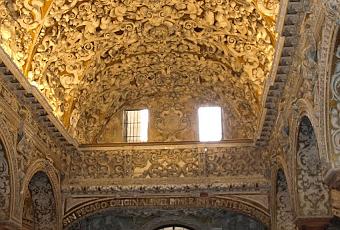 Tras la robusta puerta de madera de dos hojas nos encontramos con un pequeño espacio con techo bajo, es la entrada bajo el coro. Allí se puede leer sobre las yeserías el texto "Sin pecado original en el primer instante de su ser". Mismo mensaje que se repite por el otro lado de la nave central. A la izquierda de la entrada podemos ver un lienzo de Nuestra Señora del perpetuo Socorro.