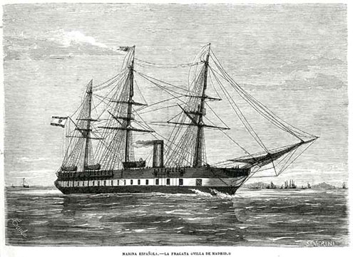 A día siguiente partieron los tres barcos. El Villa de Madrid era una fragata de madera construida en Cádiz en 1862 que movía las hélices con una máquina francesa de 800 caballos, seis calderas y veinticuatro hornos. En sus depósitos cabían de manera holgada 750 toneladas de carbón, combustible suficiente para navegar casi diez días a toda velocidad; tenía montados 42 cañones rayados de diferentes calibres, además de obuses y el armamento ligero de la infantería de marina. Las otras dos naves que componían la flotilla, las fragatas blindadas Victoria y Numancia, habían sido fabricadas en astilleros de Inglaterra y Francia respectivamente. Cada una de ellas contaba con motores de 1.000 caballos de vapor cada. La fragata Numancia había sido el primer buque blindado en dar la vuelta al mundo bajo el mando del citado Casto Méndez, fijándose en su honor el siguiente lema [latinajo]: "Enloricata navis que primo terram circuivit"; estaba dotada, además de la máquina de vapor, con un aparejo de 1864 metros cuadrados; en sus depósitos de combustible se podían acumular con normalidad 1.100 toneladas de carbón. En ese año de 1870 estaba armada con 16 cañones de ánima lisa y 9 rayados.