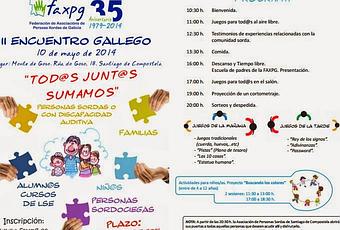 El próximo 10 de mayo, en el Monte do Gozo en Santiago, la FAXPG tiene previsto organizar el II ENCUENTRO GALLEGO “TOD@S JUNT@S SUMAM@S”, con el objetivo de que tanto los alumnos/as de los cursos de Lengua de Signos, como las personas sordas, personas sordociegas, las familias y los/as niños/as puedan compartir un día lúdico e intercambiar experiencias.