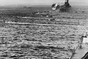 Wikipedia, fuente de la imagen y la leyenda. Vehículos de desembarco anfibio rumbo a la costa, el 15 de junio de 1944. En primer plano, el USS Birmingham (CL-62), desde donde se toma la fotografía; a lo lejos, el crucero que abre fuego es el USS Indianapolis (CA-35)