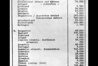 En la Conferencia de Wansee (20 de enero de 1.942), a las afueras de Berlín, quince dirigentes del Gobierno y del Partido Nazi, dirigidos por R. Heydrich, conocieron y dieron su consentimiento a los planes para llevar a cabo la "solución final" al problema judío. Se aprobó un documento elaborado por Eichmann que contemplaba el exterminio de once millones de judíos (tabla adjunta). Contenía las cifras, por países. Eslo que se conoce como Solución Final. Hay que señalar que ya había comenzado el asesinato masivo de judíos, especialmente en las zanos ocupadas de Polonia y la URSS.