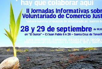 II Jornadas Informativas sobre Voluntariado de Comercio Justo ¿cuándo? 28 y 29 de septiembre ¿horario? 18:30 a 20:00 h. ¿dónde? sala multiusos de El Surco. C/ Juan Pablo II nº26 - Santa Cruz de Tenerife para inscribirte: llámanos, pásate por la tienda o mándanos un correo con tu nombre, dni y teléfono PARA CAMBIAR LAS COSAS ALLÍ HAY QUE COLABORAR AQUÍ