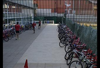 Esta vez no utilizan vallas, va a ser más cómodo coger y dejar la bici tenemos una silla con nuestro dorsal , esta vez tengo el 151 y allí me dejo preparado el casco y el dorsal y al lado de la bici las bambas.