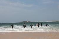 Muchos fueron los valientes que se animaron a nadar a pesar del oleaje y el levante. Al final hubo mas "peligro" en la salida que en el interior, ni nos enteramos de las olas. El reportaje fotográfico deja claro las intenciones de los participantes. Fairplay?? ejem ejem. Las fotos son claras, no hay lugar a dudas. Qué ibamos a ir esperándonos, de tranquis, disfrutando del paisaje, ........, bueno bueno, de nuevo me remitiré a las fotos. Impresionante arrancada de algunos (Usain Bolt?? Un principiante comparado con lo que alguno demostró en Caños) Las fotos también dejan un misterio en el aire: cómo el snorkel pasa de Iñaki a Coquere en plena marejada???