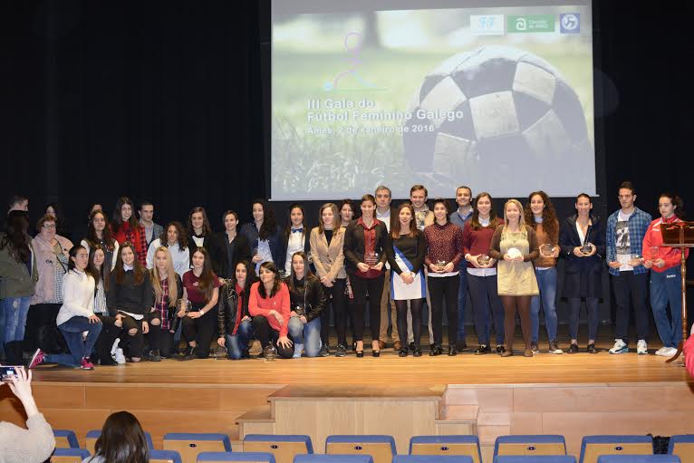 A III Gala do Fútbol Feminino Galego proclamou a Marcos Canle (Bértola), Sarita Tui (El Olivo) e Sara Pazos (At. Arousana) como os últimos grandes gañadores da temporada 2014/15A Gala rebasou todas as expectativas de asistencia. Máis de 170 persoas encheron a Auditorio Municipal do Milladoiro para homenaxear o traballo das xogadoras na pasada temporada.Ames, co seu alcalde respaldado por parte da súa corporación, demostrou o por que queren posicionarse como un dos lugares de referencia do deporte feminino na nosa ComunidadeA Gala comezou co protagonismo de Ángela, a guardarredes do Arcadia, quen saíu para recoller o trofeo que rexistraba unha marca espectacular: 1 só gol recibido nos 17 partidos xogdos na pasada Liga no seu grupo de Segunda Galega.O Victoria, un dos clubs con maior e coidada estrutura de base, estivo representado por unha das súas dianteiras con máis futuro. Tati Barcia. Os seus 44 tantos para o filial conducírona ao premio destinado á mellor goleadora da Segunda Galega.O Tordoia foi o gran vencedor sumando recoñecementos na Primeira Autonómica. Unha campaña fantástica tivo como resultados que a súa guardarredes, Lucía, e a súa dianteira, Rebeca, sumaran os mesmos honores que na campaña anterior cando o equipo ascendera da Segunda Galega, menos goleada e máxima artilleira, respectivamente.