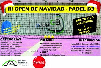 El III Open de Navidad organizado por el Club Padel D3 tendrá lugar los días 26 al 28 de diciembre de 2014 y 2 al 4 de enero de 2015.