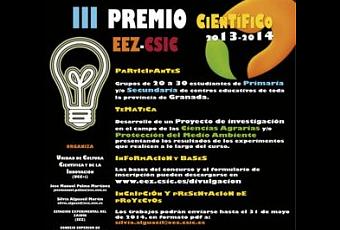 La Unidad de Cultura Científica y de la Innovación (UCC+i) de la Estación Experimental del Zaidín (EEZ), centro perteneciente a la Agencia Estatal Consejo Superior de Investigaciones Científicas (CSIC), con el patrocinio de la Fundación Descubre, Parque de las Ciencias, Mycovitro S.L. y Allergenome S.L., convoca el III Premio Científico EEZ para el curso 2013-2014.