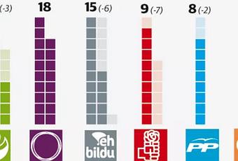 Según el sondeo realizado por Ikertalde y publicado por el gobierno vasco, Podemos alteraría considerablemente la distribución de fuerzas en el parlamento vasco. Si se produjesen elecciones, previstas para este otoño, la formación de Pablo Iglesias se estrenaría como segunda fuerza en el hemiciclo vasco con 19 escaños, a sólo 6 del PNV que mantendría su primera posición con 24 diputados a pesar de perder 3 con respecto a 2012. Cerca de Podemos estaría Bildu, que con 15 escaños pierde la segunda posición y cede 6 diputados. Los socialistas también se verían afectados por la aparición de Podemos al perder casi la mitad de su representación, pasando de 16 escaños a tan sólo 9. Los populares seguirían en mínimos históricos al perder 2 de los 10 escaños conseguidos en las elecciones de 2012, y finalmente Ciudadanos se tendría que conformar con un escaño que arrebataría a UPyD.