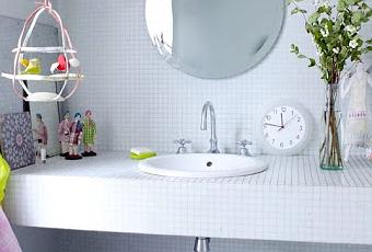 Un sencillo baño en colores neutros puede cobrar vida con unos sencillos matices de color en complementos y textiles. En concreto en este que os muestro en las imágenes las pinceladas de verde y morado le dan un aire nuevo y mas cálido al frío gresite en tonos blancos.