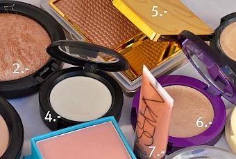 1.- Too Chic M.A.C, 2.- Soft&Gentle M.A.C, 3.- CCB Pearl M.A.C, 4.- CCB Luna M.A.C, 5.- Geleé Estée Lauder, 6.- Sin Urban Decay, 7.- Orgasm Nars, 8.- Luminance Elf, 9.- The Famous Flamingo Essence, 10.- Moonlight Belleme Como ven los hay en formato polvo: Como los Too Chic, los Soft & Gentle, los Gelée, los Luminance, los The Famous Flamingo y los Moonlight. En formato crema: como los Pearl, Luna y Sin (este último tengo que decir que se ha convertido en unos de mis preferidos, me parece espectacular, ya les había hablado de él aquí. Y en formato liquido: que es el Orgasm.