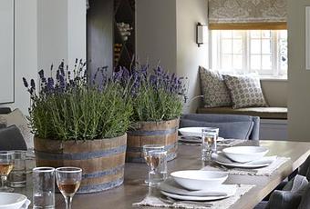 La verdad es que el comedor me parece increíble, la lámpara, la mesa de madera, las sillas en color gris y el centro de mesa con lavanda… ¿Se puede pedir más?