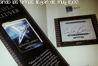 Legacy es una de mis sagas favoritas y cuando me enteré de que el último libro no sería publicado en español, contacte con la autora para intentar conseguir el 3º libro firmado en inglés. No pudo ser, pero Cayla me escribió unos meses después para ofrecerme el envío de su firma ¡Mil gracias! (¿Ya he dicho la gran ilusión que me hace?) Como podéis ver me llegó junto a un marca-páginas de su nuevo libro (el cual espero poder conseguir pronto).