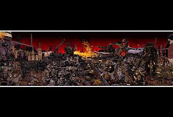 Vista en grande esta un poco mejor,ya que en ese tamaño que os puesto parece una ensaladilla rusa*,al ser lo visualmente mas fácil de identificar(Bueno,ensaladilla soviética.Ya que elementos nazis característicos brillan por su ausencia.Si no llega a ser por un par de carteles y los Stahlhelme que lucen sus rivales,podrían ser Soviéticos contra casi cualquiera.Unas esvasticas o unas cuantas Reichsadler/Parteiadler no hubieran estado mal,sobre todo en una proporción parecida a hoces y martillos).Así que para juzgarla mejor verla mas grande.