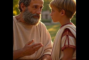 344 antes de Cristo. El filósofo Aristóteles, de 40 años de edad, explica conceptos de filosofía al príncipe Alejandro, de 12.