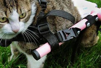Ella es Brigitta, la gata en silla de ruedas. Una mujer miembro de una sociedad protectora de animales la adoptó y le puso este artefacto, luego de que un disparo de rifle de aire comprimido le quitara la movilidad en sus patas traseras.