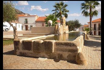 La conocida como Fuente de los Cuatro Caños, Pilar de los Cuatro Caños, o inclusive Fuente del Pilar de los Cuatro Caños vuelve a lucir los cuatro surtidores que le dieron nombre, tras la reconstrucción efectuada sobre el monumento en 2.014, desaparecidos los primitivos grifos pero no el abrevadero original donde el agua sobrante era vertida, subsistiendo igualmente el escudo imperial que lo decora, ubicado éste en la zona central del pilón y punto de unión entre el área de abastecimiento humana y la de uso animal de que se compone la obra hidráulica.Hornachos (Badajoz). Siglo XVI (año de 1.580, según reza en la inscripción conservada sobre el blasón: "ESTA OBRA MANDO HAZER EL ILVSTRE SEÑOR LICENCIADO CORONEL DON IVAN GOVERNADOR POR SV MAGESTAD AÑO DE MDXXX"); estilo renacentista.