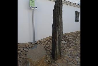 Arriba y abajo: visto desde su flanco oriental (arriba), meridional (abajo), así como norteño y de poniente (abajo, siguiente), para la confección del menhir de La Cardenchosa fue utilizada una gran laja de pizarra negra que ronda los 2,5 metros de longitud, llamativa, más que por sus dimensiones, por su propia naturaleza, poco común la pizarra entre los piezas pétreas y ortostatos que componen los monumentos megalíticos enclavados tanto dentro de nuestra región como en el marco peninsular en el que se enclavan, frente a una preponderancia del granito que, sin embargo, no impide el poder descubrir el empleo de esta tipología rocosa en yacimientos contemporáneos al azuagueño, así en los dólmenes de Lagunita, en las cercanías de Santiago de Alcántara, o en otros muchos de estos prehistóricos panteones inscritos igualmente en la vertiente sureña del valle del río Tajo, apreciándose en la lasca usada en la Campiña Sur, componente del único menhir conocido dentro de tal comarca del Sureste pacense, las características alineaciones que ofrece habitualmente esta roca metamórfica, permitiendo tal esquistosidad el poder observar en el extremo superior de la cara levantina de la pieza (abajo, imagen tercera), lo que algunos autores han considerado una representación esquemática y en relieve de lo que pudiera ser un reptil de tipo latercilio, mayoritariamente considerado sin embargo un simple capricho de la piedra sin que, por el contrario, fuese extraordinario el descubrir dibujos o incisiones labradas entre las caras y flancos de un menhir, tal y como puede apreciarse en el ejemplar del Cabezo, levantado en las cercanías de Alcántara, o en piezas megalíticas utilizadas entre diversos edificios dolménicos, observándose dibujos en el interior del dolmen de Magacela, incisiones rupestres en el dolmen de Sierra Gorda, en la proximidades de Valle de la Serena, o lo que también algunos han creído ver como un reptil, concretamente un ofidio, en el dolmen de Guadalperal, dentro del término de El Gordo, si bien esta última representación ha sido tomada por diversos autores no como un animal sino como simbología del inmediato cauce fluvial, hoy responsable del nutrir del embalse de Valdecañas, cuyas aguas mantienen habitualmente sepultada la propia construcción prehistórica.
