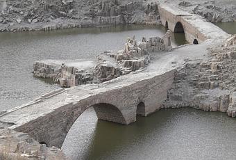 Imagen presentada por los Puentes de Don Francisco, o de Don Franscico de Carvajal y Sande, a comienzos de marzo de 2.012, tras la bajada del nivel de las aguas del Pantano de José María de Oriol (Embalse de Alcántara), bajo las que habitualmente se encuentran descansando.