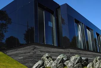 Los acabados de fachada en esta vivienda unifamiliar A-cero Tech están realizados en composite negro y vidrio negro. En esta imagen os mostramos la vivienda ya instalada en una recreación del paisajismo resuelto.