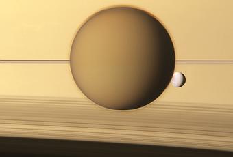 Arriba: El 21 de mayo, Cassini vio a Dione pasar detrás de Titán cuando ambos pasaban frente al disco de Saturno. Las nubes de gran altura den Titán forman un anillo marrón, a través del cual brilla la luz de Saturno. Crédito: NASA/JPL/SSI/Composición en color por Ian Regan.