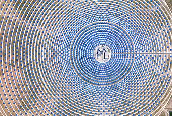 Planta Termosolar Gemasolar / 37 · 560755 °, -5 · 331908 ° / Esta vista captura la Planta Thermosolar Gemasolar en Sevilla, España. El concentrador solar contiene 2.650 espejos heliostáticos que enfocan la energía térmica del sol para calentar la sal fundida que fluye a través de una torre central de 140 metros de altura (460 pies). La sal fundida entonces circula desde la torre hasta un tanque de almacenamiento, donde se utiliza para producir vapor y generar electricidad. En total, la instalación desplaza aproximadamente 30.000 toneladas de emisiones de dióxido de carbono cada año.