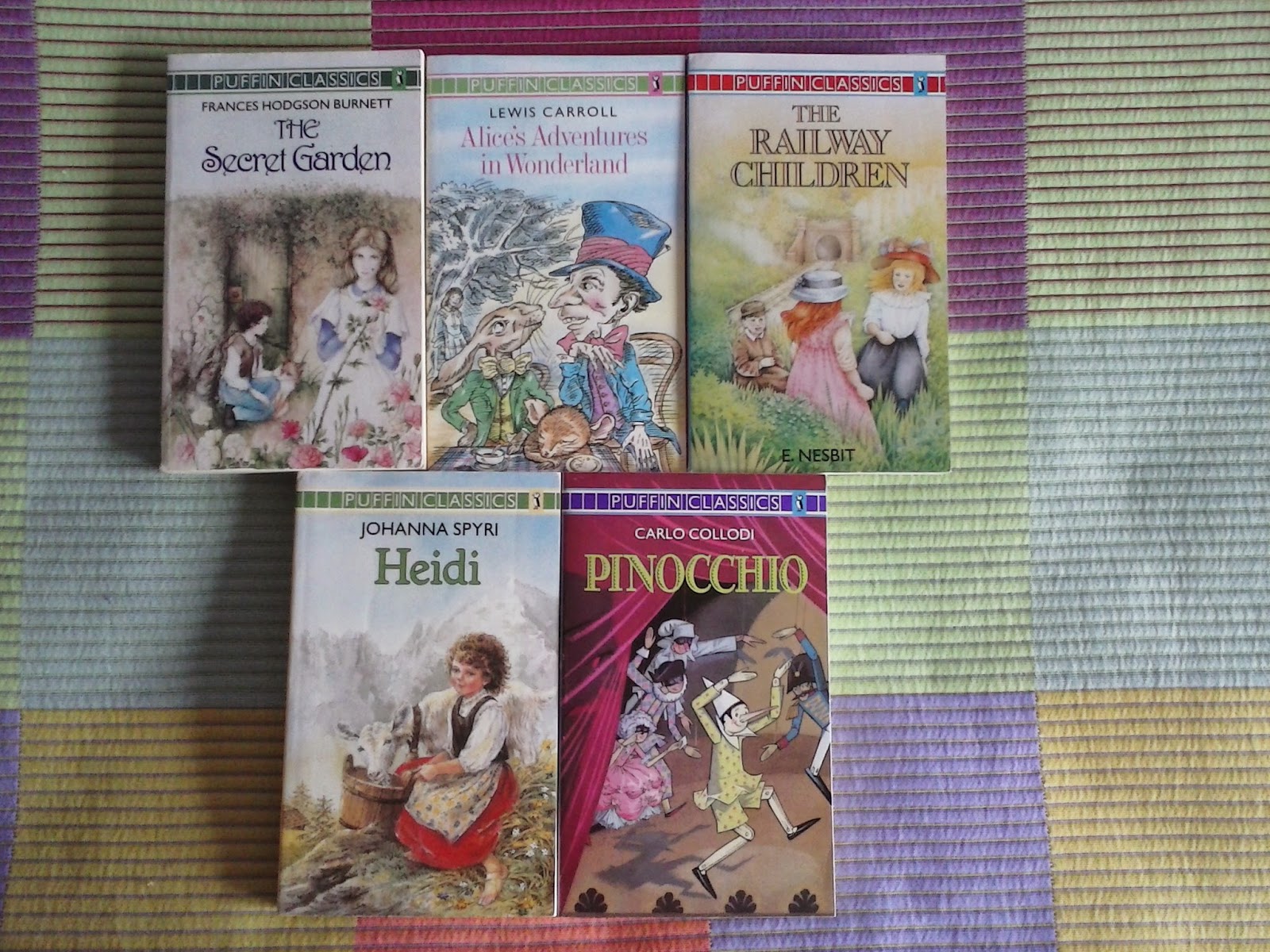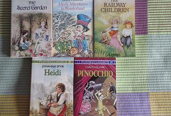 The secret garden, Alice's adventures in Wonderland, The railway children, Heidi y Pinocchio. Estos cinco libros en inglés los compré en la cuesta Moyano en Madrid la última vez que fui para el FLIJ de Tres Cantos. En cuanto la vi no dudé en comprar el pack ya que estaba por 5€, además de ser una preciosidad de portadas. No sé cuando me pondré a leerlos pero espero que sea dentro de este año porque querría leer algo en esta lengua.