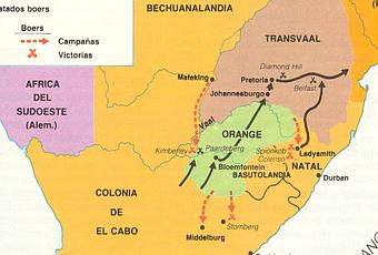 - Al comienzo de la guerra, los afrikáners (Boers), dirigidos por P. Kruger, tomaron la iniciativa invadiendo Natal. Más que un ejército las tropas Boers eran "comandos" de entre 200 y 1000 personas, burgueses que aportaban su propio armamento. Aprovechando el desconcierto inglés, estos comandos avanzaron en varias direcciones, llegaron a sitiar tres importantes ciudades ferroviarias: Ladysmith, Kimberley o Mafeking. También obtuvieron victorias sobre los ingleses en las batallas de Magersfontein, Colesberg y Stormberg (diciembre de 1899). El ejército inglés, tras su derrota en la batalla de Colenso, estaba en serios problemas en este momento, pero los Boers también tenían serios problemas de suministros.