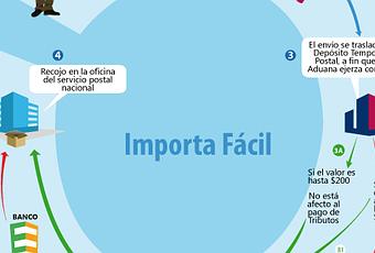* Si tú o tu empresa desean importar mercancías del extranjero cuyo valor total no supero los dos mil dólares americanos (US$ 2,000), pueden usar un sistema rápido y simple denominado IMPORTA FACIL , que te permite importar mercancías del extranjero a través de la empresa del servicio postal nacional.* Si el valor de la mercancía no supera US$ 200, no tendrás que efectuar ningún trámite aduanero ni pagar tributos a la importación.* Si el valor de la mercancía supera US$ 200 y hasta US$ 2,000, el pago de los tributos a la importación los puedes cancelar en cualquier entidad bancaria autorizada, presentando la Declaración Importa Fácil que podrá descargar gratuitamente desde internet.