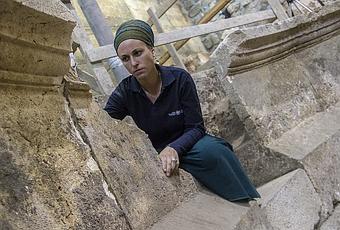 La arqueóloga de la Autoridad de Antigüedades de Israel, Tehila Lieberman, en la estructura del teatro en los túneles del Muro Occidental de Jerusalén. (Yaniv Berman, cortesía de la Autoridad de Antigüedades de Israel).