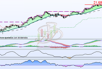 El sector al que pertenece Enagás es el de Gas, agua y servicios múltiples que pese al recorte que está realizando en las últimas semanas continúa alcista por lo que se pueden buscar valores con opción a compra dentro del mismo. Este es el caso de Enagás. Hace algo menos de un mes comentábamos el hecho de que en Enagás se pudiera producir una posible señal de compra. Dato que confirmó la vela de esa misma semana al cerrar por encima de la resistencia de los 21,68€ (que corresponden a los 22,48€ antes de realizar el reparto de dividendos la semana pasada).