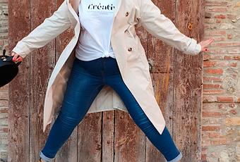 En el primer look aposté por la sencillez y atemporalidad de un buen trench largo (tengo uno más corto y hacía tiempo que me llamaba la idea de su versión más maxi), un vaquero pitillo y una camiseta blanca... ¡pero no cualquier camiseta blanca! ¡NO! Toda una declaración de intenciones con una de las palabras que más me indentifican en este momento de mi vida... ¡CREATIVA!