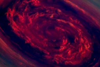 El espectacular vórtice de la tormenta en color rojo oscuro. Justo en el centro del hexágono situado en el polo norte. Las nubes que lo rodean aparecen en color naranja. También observamos otro pequeño vórtice formándose al sur de la imagen.