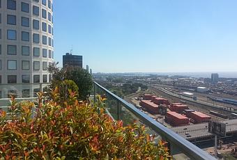 El Río de la Plata desde un edificio de altura en la zona de Retiro, la villa 31, la autopista y un cielo claro. Jornada de sol tibio y agradable en la Ciudad de Buenos Aires al mediodía.