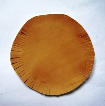2.- Para la CABEZA: a) En una cartulina blanca se pinta con témpera del color café claro, para que queden iguales ( cabeza y cuerpo ). Si tienes cartulina del color del cuerpo del león, úsala y te evitas el pintar. b) Se recorta un círculo, al cual hay que hacerle un fleco, como se observa en la imagen: