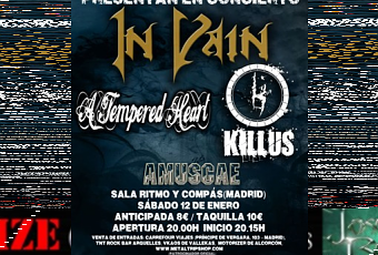 El próximo día 12 de Enero, IN VAIN tocarán en Madrid en la sala Ritmo y Compás acompañados de Killus venidos desde Villarea,. los barceloneses A Tempered Heart y los madrileños Amuscae a partir de las 20:00 horas. Os dejamos una breve reseña de las bandas.