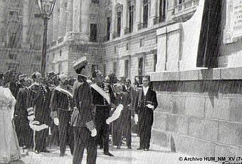 Tiró el rey de un rojo cordón de seda, dejando al descubierto la lápida que hasta ese momento había estado custodiada por dos servidores del Círculo de Bellas Artes. Sonaron los acordes del pasodoble de Chueca y los vítores y aplausos del pueblo allí reunido.