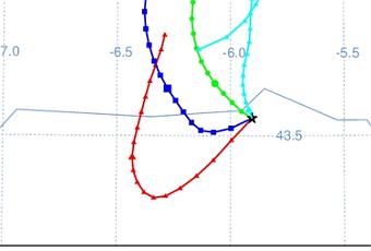 Trayectorias aproximadas que seguirá una particula emitida por el incendio de Arcelor (Avilés, Asturias) en diferentes momentos de las 12 horas siguientes al comienzo del evento (16.10.2018 a las 14:00 UTC) según HYSPLIT-NOAA con GFS.