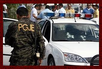 ---Oficial de policía custodiando una patrulla atacada a tiros, tomado de Yahoo!.